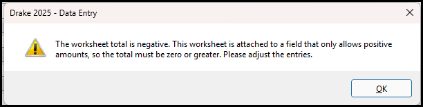 The total for a worksheet cannot be negative if the field does not allow negative values. If you attempt to save a worksheet with a negative total that is not allowed, you will see the following pop-up: