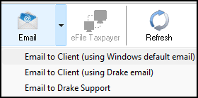 The Email toolbar button uses your default View/Print mode email setup. However, you can always use your Drake email account whenever you email- use the Email down list to select Email to Client (using Drake email).