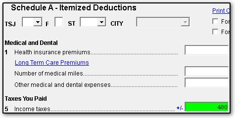This amount will update to next year's return, Schedule A, line 5 and be flagged (in green) for review. You should verify this amount for accuracy in the updated return. It is the preparer's responsibility to determine whether the client can deduct the full amount that carries to Schedule A, line 5 from the prior year.